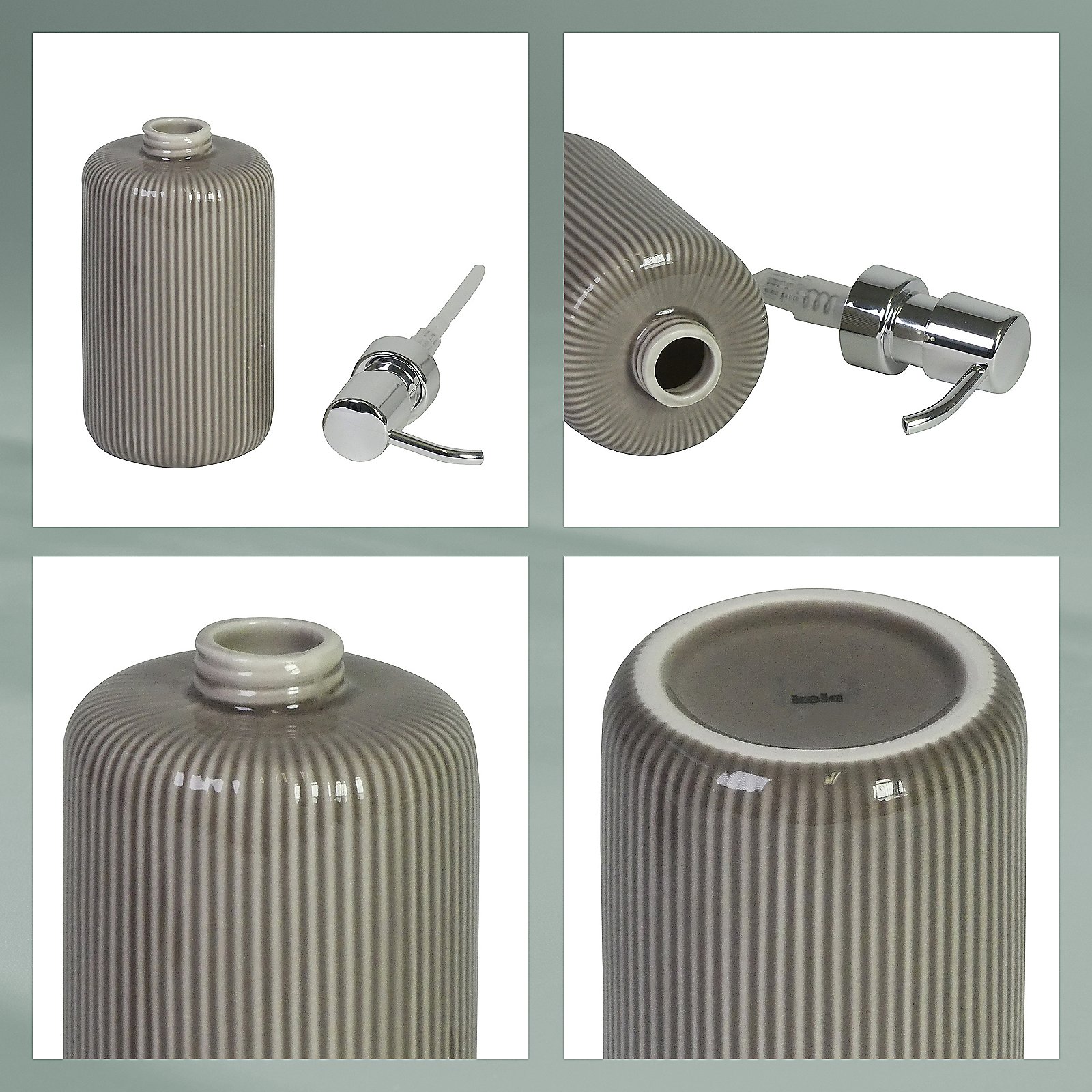 Een stijlvolle toevoeging aan je badkamer: De prachtige Ava keramische zeepdispenser in steengrijs, met 350 ml inhoud. De vervangbare pomp is van verchroomd kunststof. Hoogte: 17,5 cm.