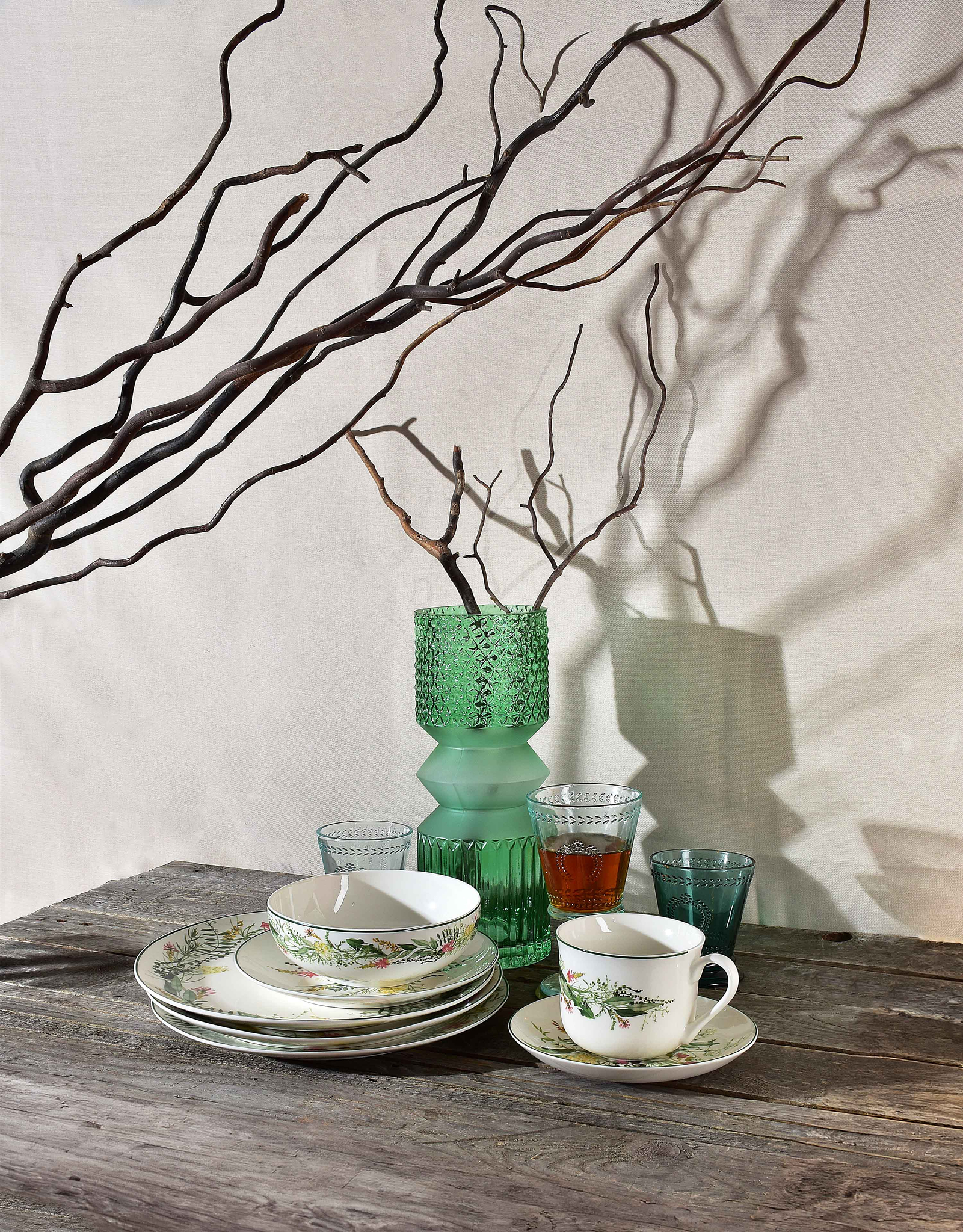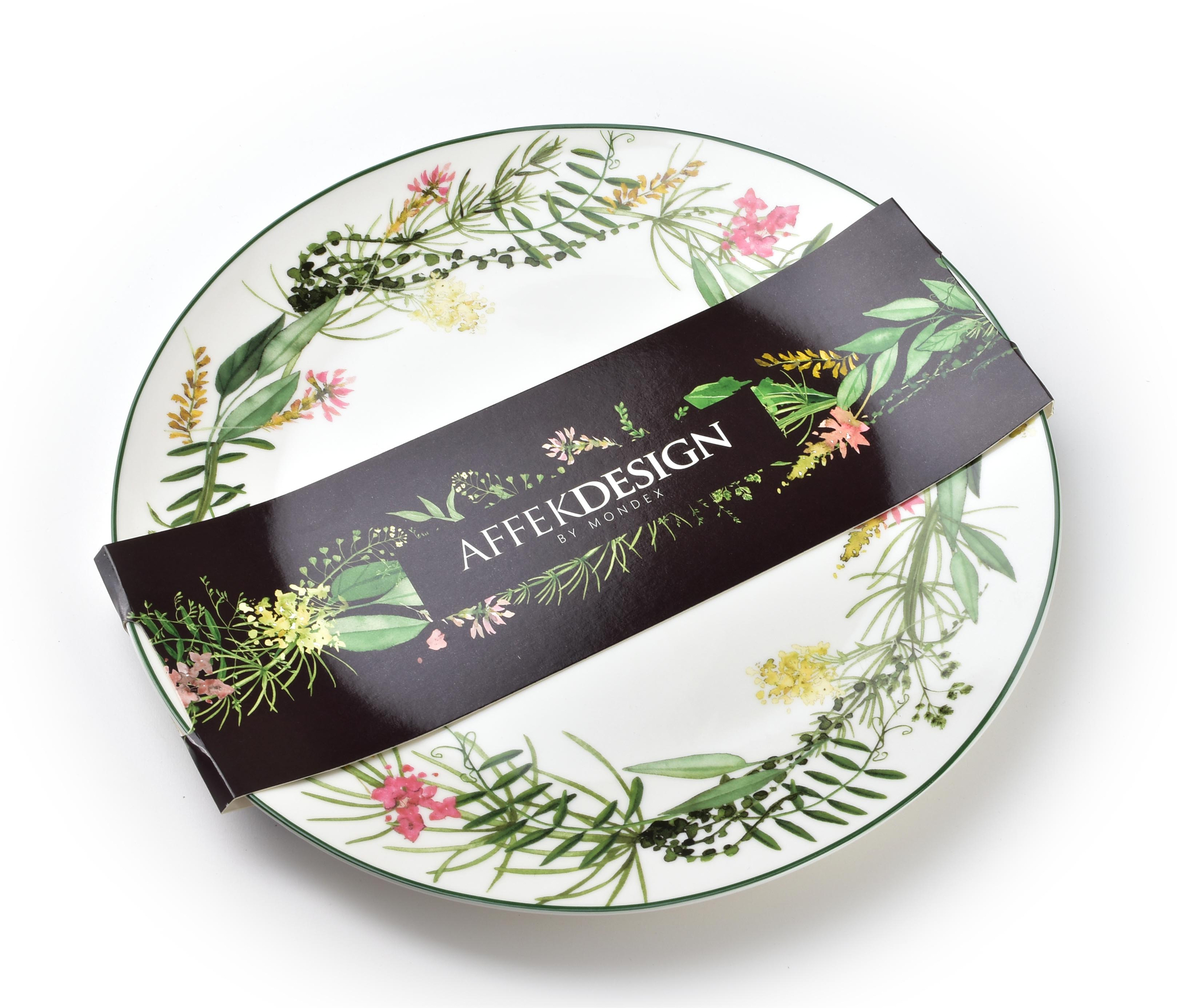 Porcelain dinner plate from the IDYLLIC collection by AFFEKDESIGN. This series features a spring herb tableware set, bringing warmth and joy to your dining room! Suitable for microwave and oven use. Made of New Bone China porcelain. Dimensions: 26.9×2.6cm, weight: 525g. Quality: grade I. Food contact safe. Packaging: sleeve. Dishwasher safe.