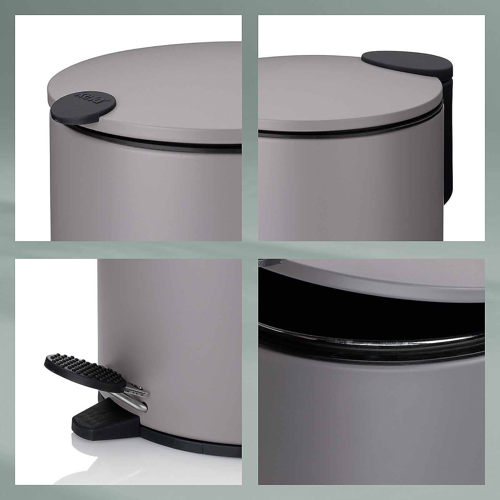“Nette prullenbak Mats 12 L van metaal in mat zilver – de stille manier om afval te verwerken. Dankzij het geruisloze sluitsysteem merk je niet dat de deksel dicht is. De moderne uitstraling van de Mats prullenbak maakt hem een blikvanger. Met antislipbasis voor extra stabiliteit.”