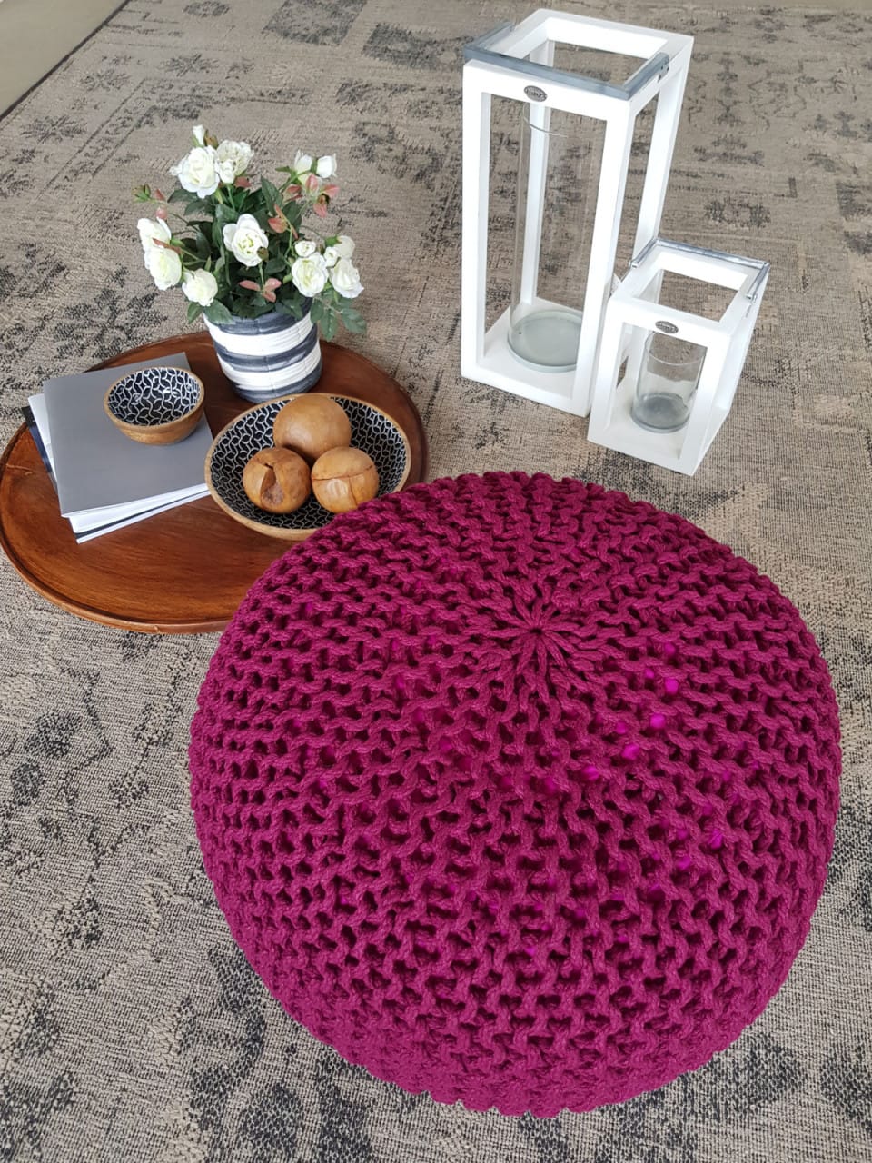 Hoogwaardige gebreide kruk met een diameter van 55 cm en een hoogte van 37 cm. Geschikt voor binnen, terras, zwembad en tuin. Verkrijgbaar in diverse kleuren. Premium kwaliteit, wasbaar en gemaakt van duurzaam gerecycled plastic. Gevuld met piepschuimkorrels. Kan gebruikt worden als bijzettafel, zitplaats, speeltafel of voetenbank. Veelzijdig en 100% waterbestendig. Maak van elke plek – kamer, tuin, terras of zwembad – een gezellige plek met deze stijlvolle gebreide poef.