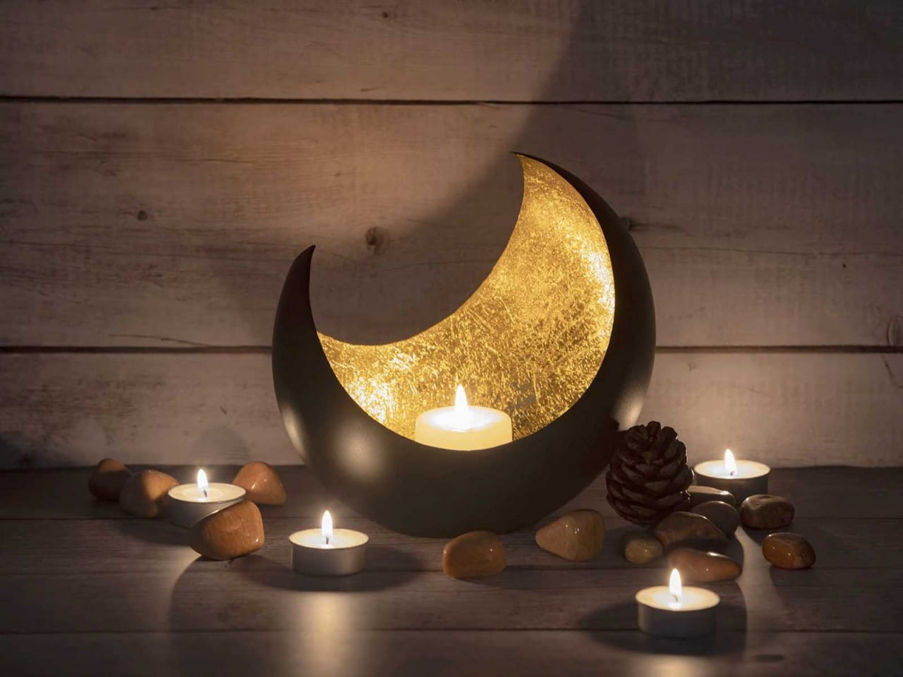 The text translated to Dutch is: “Theelichthouder 16-delig Kaarshouder Kaarsenstandaard Maan Sikkelvorm zwart mat binnenin verguld”