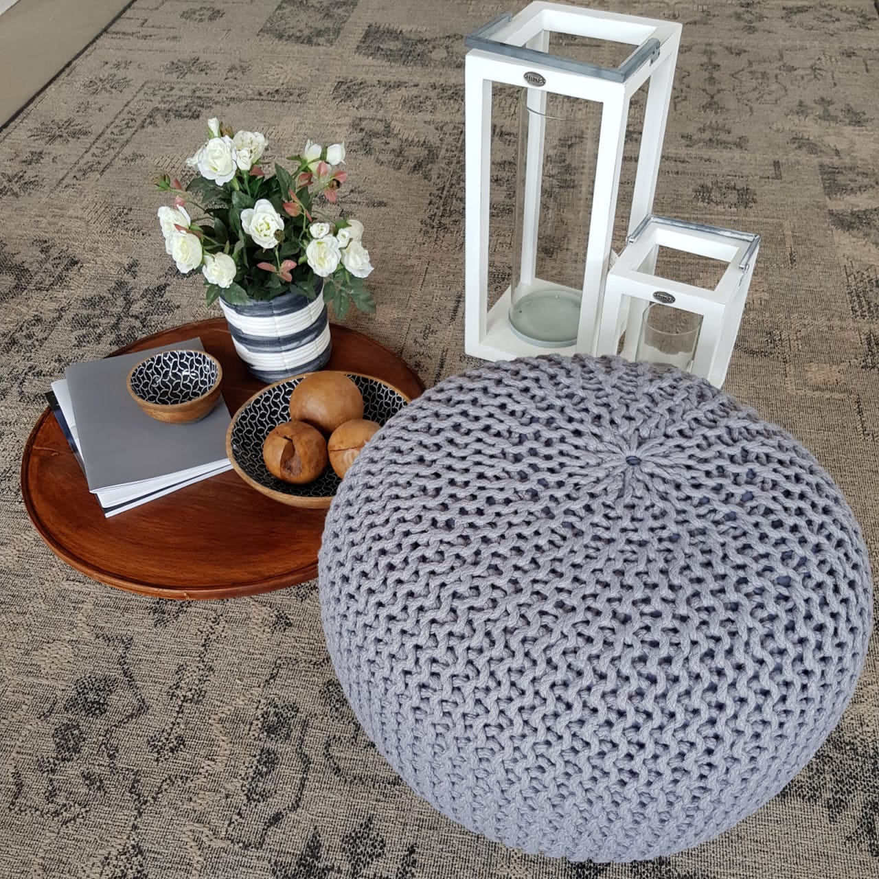 Hoogwaardige Sitzpouf in grof gebreide look, Ø 55cm, voor binnen, terras, zwembad, en tuin. Beschikbaar in diverse kleuren. De premium pouf is wasbaar en gemaakt van 100% gerecycled kunststof met styroporkorrels als vulling. Kan gebruikt worden als bijzettafel, zitplaats, speeltafel, of voetenbank. Dit Bodenkissen is flexibel en 100% waterdicht, geschikt voor elke locatie!
